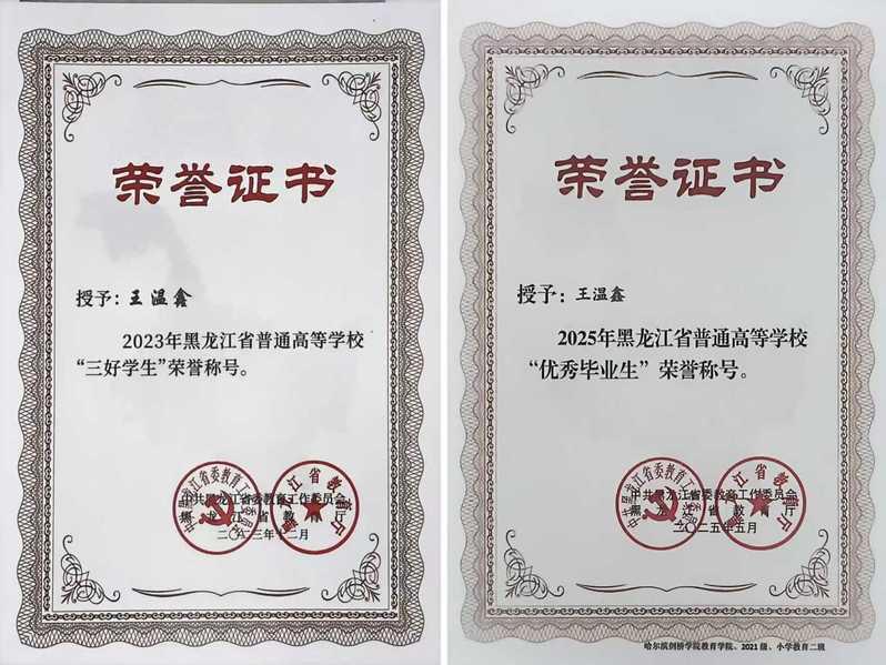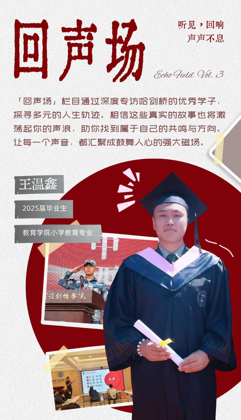 2025年6月從哈爾濱劍橋?qū)W院教育學(xué)院小學(xué)教育專業(yè)畢業(yè)的王溫鑫,用這句話總結(jié)了自己的成長感悟。
