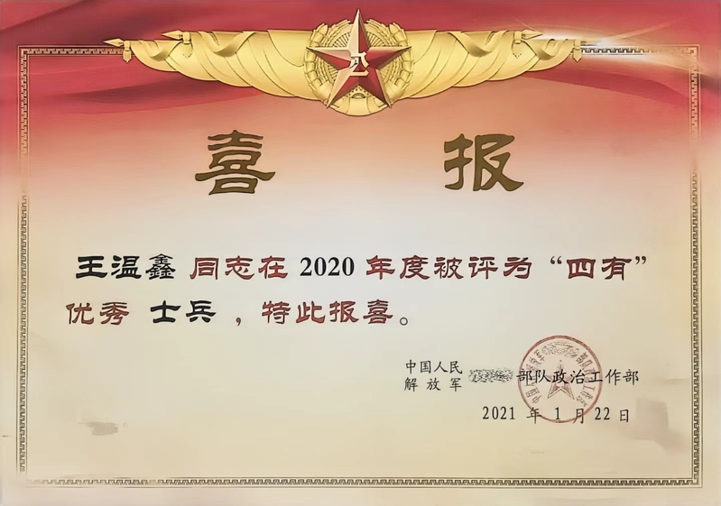 這個看似偶然的決定,卻成為他成長過程的重要轉(zhuǎn)折點(diǎn)。在部隊兩年,他憑借出色表現(xiàn)擔(dān)任了偵查班班長,并榮獲“四有”優(yōu)秀士兵稱號。