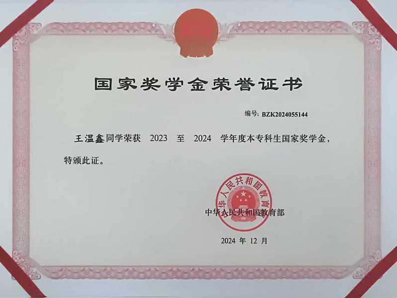 在學(xué)業(yè)上,王溫鑫同樣毫不松懈。多次榮獲國家獎學(xué)金、國家勵志獎學(xué)金、松嶺獎學(xué)金,平均成績始終保持在95分以上,畢業(yè)論文還被學(xué)校評為優(yōu)秀畢業(yè)論文。