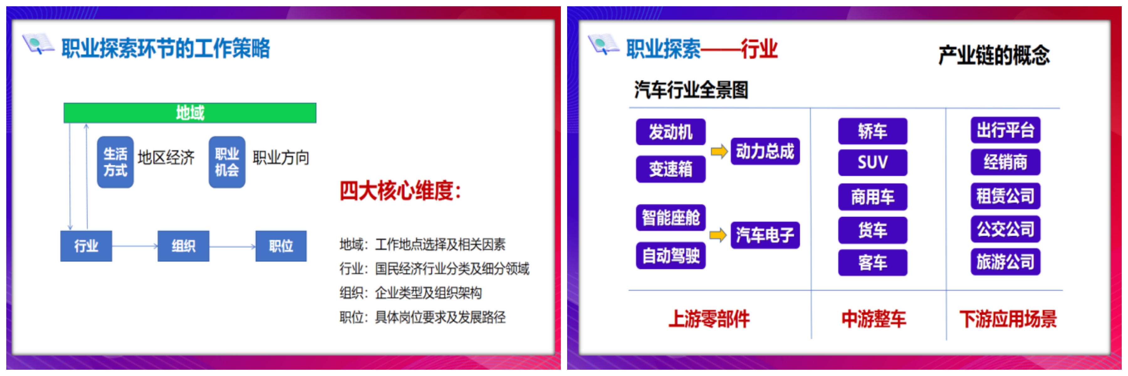 活動的下半場聚焦實踐和方法論。李薇系統(tǒng)闡述了職業(yè)探索的四大核心維度:“地域、行業(yè)、組織、職位”,并為在場大學生提供了針對性的職業(yè)調研策略與實用工具:在城市選擇上,李薇建議應超越個人偏好,采取數據化與產業(yè)化的雙重分析框架。她推薦結合《城市商業(yè)魅力排行榜》與“產業(yè)聚集區(qū)”理論,根據不同產業(yè)的地理分布特點(如電子信息產業(yè)集中于長三角、珠三角,傳媒影視業(yè)以北上廣為核心)進行科學決策。在行業(yè)選擇方面,她提出了一套系統(tǒng)性評估方法:首先關注國家政策導向,如硬科技與新能源等戰(zhàn)略領域;其次分析行業(yè)的核心驅動力,判斷其為技術驅動或資本驅動;最后,通過“產業(yè)鏈地圖”等工具,對目標行業(yè)進行從上游到下游的全面梳理,以規(guī)避潛在風險,實現精準切入。同時,她還介紹了一些職業(yè)工具:學職平臺、O*NET、知乎、看準網……現場同學紛紛拿起手機瘋狂收藏。