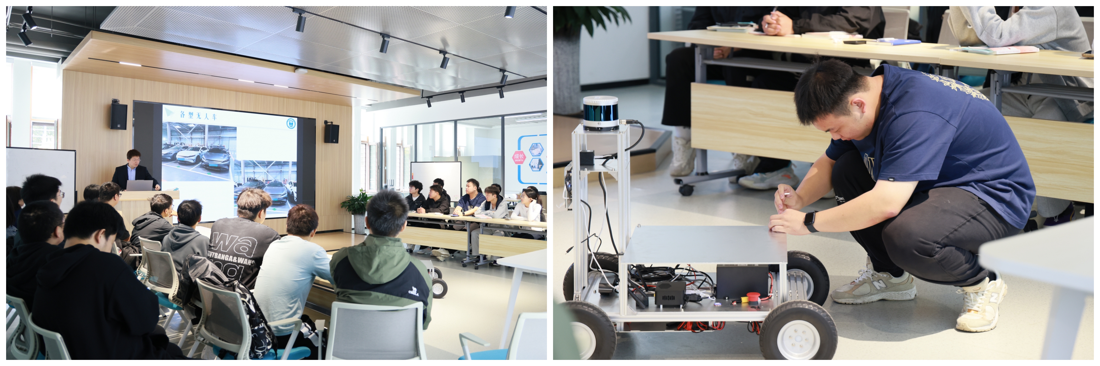 在無人車課程現(xiàn)場,劉勃博士以生動(dòng)的語言拆解無人車的“感官與大腦”——感知、融合、系統(tǒng)架構(gòu)與導(dǎo)航控制等關(guān)鍵技術(shù)邏輯。他將抽象理論融入真實(shí)應(yīng)用場景,引導(dǎo)學(xué)生從“圍觀者”變?yōu)椤凹夹g(shù)玩家”。在互動(dòng)環(huán)節(jié),師生圍繞“履帶車設(shè)計(jì)”展開思維碰撞,從結(jié)構(gòu)解析到場景拓展,再到優(yōu)化路徑,層層推進(jìn)的探討點(diǎn)燃了學(xué)生對(duì)特種車輛研發(fā)的熱情,現(xiàn)場氛圍活躍、掌聲不斷。