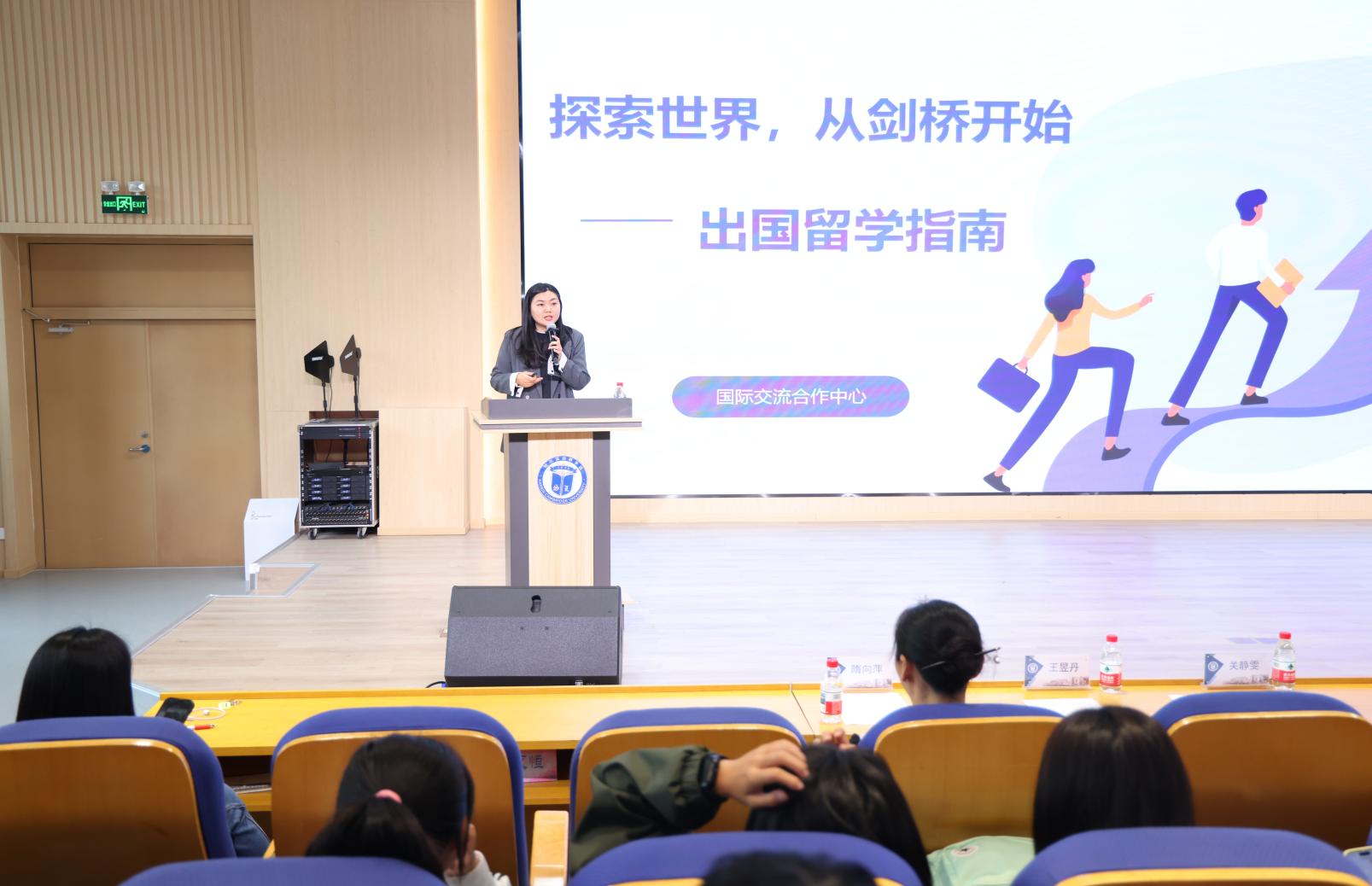 國際交流合作中心教師王昱丹則為同學們打開了“出國留學” 的視窗,她圍繞校內(nèi)資源支持、海外求學發(fā)展趨勢、熱門留學目的地選擇、申請流程以及過往成功案例逐一介紹,細致地解答同學們的疑問,幫助有志于拓展國際視野的同學明晰前進方向。