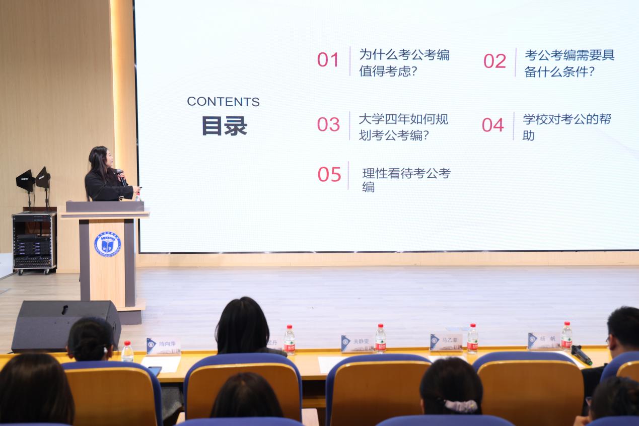 外部講師張老師聚焦“考公考編”方向,從備考策略、大學四年時間規(guī)劃與應試準備等方面展開深入講解,為同學提供了極具操作性的指導。