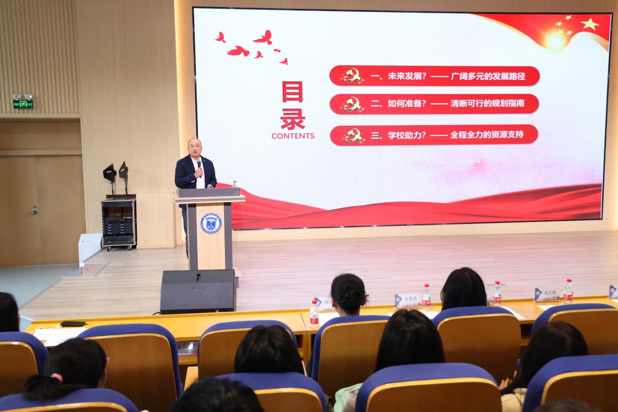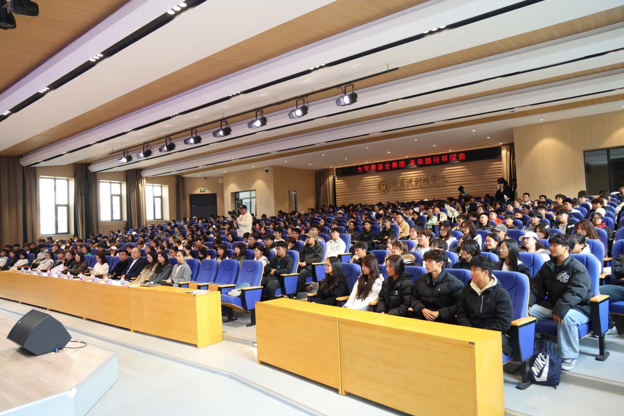 10月14日,我校正德樓報告廳內(nèi)座無虛席,400余名同學踴躍參加本學期職業(yè)素養(yǎng)系列活動之“大學賽道全景圖 未來路徑早探索”講座。本次活動以就業(yè)為導向,由產(chǎn)教融合辦公室統(tǒng)籌規(guī)劃,聯(lián)合招生與就業(yè)服務處、團委、學生服務處、國際交流合作中心、馬克思主義學院多部門協(xié)同主辦。依托各聯(lián)辦部門的專業(yè)資源與服務優(yōu)勢,圍繞企業(yè)就業(yè)、入伍、考公考編、考研、出國等學生多元發(fā)展路徑,為大一新生從政策解讀、大學生活規(guī)劃與校內(nèi)支持三方面,系統(tǒng)式地呈現(xiàn)了一場內(nèi)容充實、指引明確的規(guī)劃盛宴。