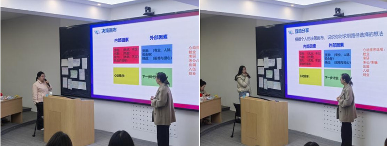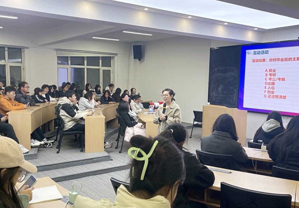 在“路徑解密”環(huán)節(jié),趙麗玲以其豐富的職業(yè)指導(dǎo)經(jīng)驗,為同學(xué)們系統(tǒng)剖析了就業(yè)、考研、出國、考公/考編、入伍、創(chuàng)業(yè)六大發(fā)展路徑?,F(xiàn)場互動氣氛熱烈,她不僅精準(zhǔn)地指出了每條路徑適合的學(xué)生特質(zhì),更客觀分析了其中的核心價值與主要挑戰(zhàn),幫助同學(xué)們跳出“哪條路更好”的思維定式,轉(zhuǎn)向“哪條路更適合我”的深度思考。