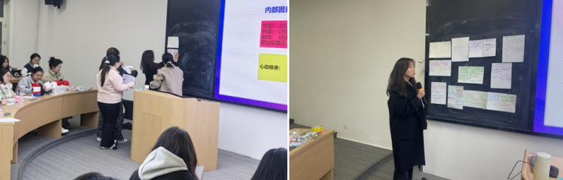 在“繪制畫布”環(huán)節(jié),同學(xué)們在趙老師的引導(dǎo)下拿起畫筆,在個人決策畫布上開啟了自我探索之旅。從“我是誰”的內(nèi)心叩問,到“路在何方”的環(huán)境分析,再到“心動排序”的理性抉擇,最后落實到“行動啟航”的具體計劃,四個象限的精心設(shè)計讓思考變得系統(tǒng)而深入。