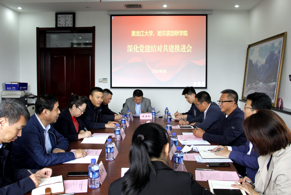 6月4日,我校與黑龍江大學(xué)深化黨建結(jié)對共建推進(jìn)會(huì)在黑龍江大學(xué)召開。黑龍江大學(xué)黨委副書記蔣晶潔、哈爾濱劍橋?qū)W院黨委書記袁偉出席會(huì)議,兩校組織部、宣傳部及部分學(xué)院黨組織負(fù)責(zé)人參加會(huì)議。會(huì)議由黑龍江大學(xué)黨委常委、組織部部長黃強(qiáng)主持。