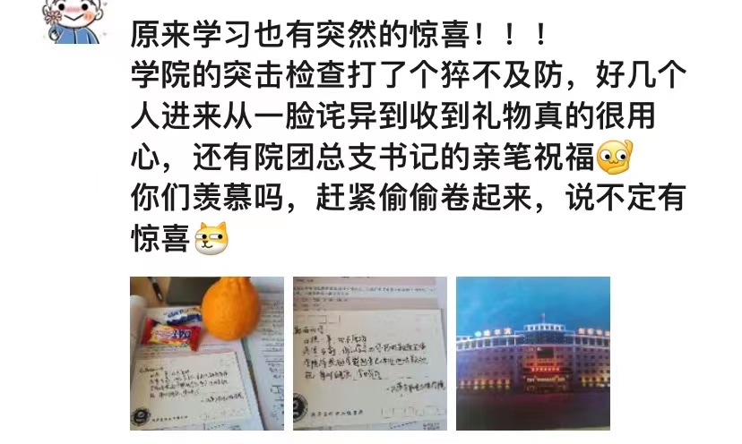 承載希冀,傳遞驚喜。收到“學(xué)霸加油包”的同學(xué)們也紛紛表達(dá)驚喜與感謝:“輔導(dǎo)員們真的很暖心,真的好感動?!薄笆盏嚼蠋煹摹⌒囊狻?!”“我們的輔導(dǎo)員太貼心了?!薄肮粚W(xué)習(xí)使我快樂?!辈⒃谂笥讶Α靶恪背觥爸歇劇钡淖院?。