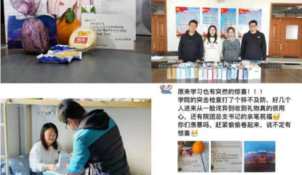 他們,是溫暖真誠的知心人。輔導(dǎo)員深入學(xué)生寢室走訪,關(guān)心學(xué)生生活狀況、學(xué)習(xí)狀態(tài),讓同學(xué)們切實(shí)感受到學(xué)校的關(guān)愛。為線上學(xué)習(xí)期間仍能保持高度自律的同學(xué)們送去“學(xué)霸加油包”,激勵(lì)大家在網(wǎng)課期間保持認(rèn)真的學(xué)習(xí)態(tài)度,充實(shí)度過在校時(shí)光。