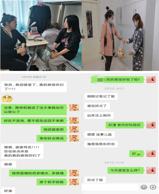 “疫”心守護(hù),溫情服務(wù)?!捌綍r(shí)看得出來,關(guān)鍵時(shí)刻站得出來,危難關(guān)頭豁得出來”,這是多年來學(xué)院學(xué)生工作的底色和烙印,越是關(guān)鍵時(shí)刻,越顯使命擔(dān)當(dāng)。輔導(dǎo)員“身兼數(shù)職”,肩負(fù)著核酸檢測組織、信息排查、身心健康守護(hù)、隔離轉(zhuǎn)運(yùn)、物資代取、患病陪護(hù)、日常檢查等工作職責(zé),微信、釘釘、視頻會(huì)議上,有他們暖心關(guān)愛的話語,公寓、樓道、操場間,有他們奔波忙碌的身影,同學(xué)們一句句“謝謝老師”“老師辛苦了”是給予他們工作最大的支持和動(dòng)力。