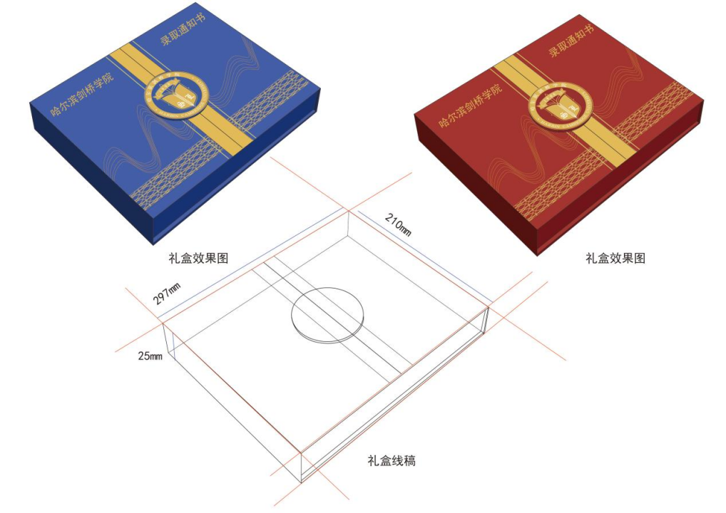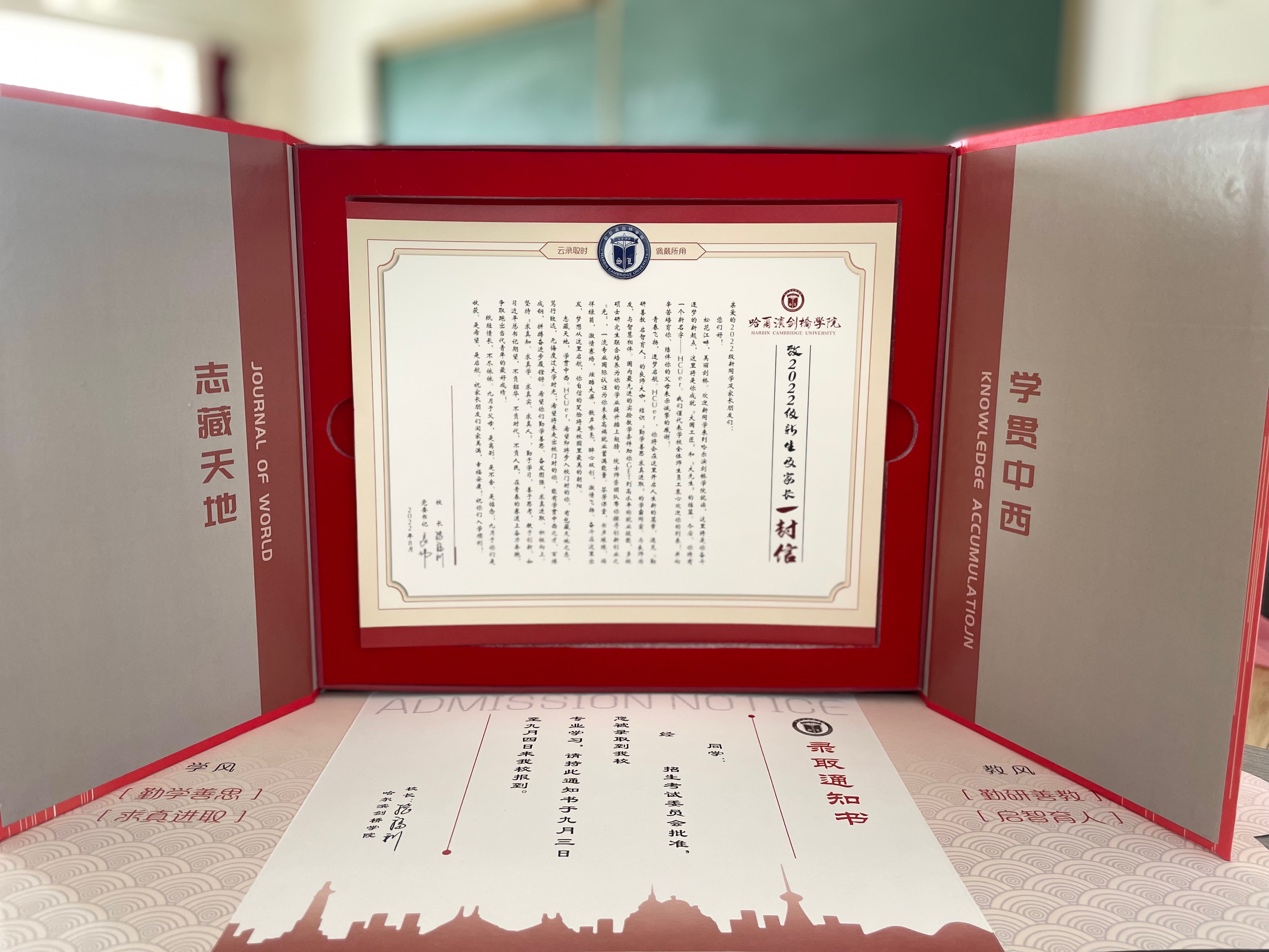“儀式感拉滿,值得一生珍藏呦!”“愛了愛了,不得不說真‘劍橋’,啥時(shí)候能到手,等不及啦!”“通知書好精致,校園好美,學(xué)哥學(xué)姐們用心啦!”……這份被新生在學(xué)校抖音、視頻號(hào)留言區(qū)直呼“顏值擔(dān)當(dāng)、用心貼心、儀式感爆棚”的錄取通知書,設(shè)計(jì)理念上融合了傳統(tǒng)文化與現(xiàn)代藝術(shù),采用了雙開門的禮盒結(jié)構(gòu),選用熱情洋溢、喜氣熱烈的紅色主基調(diào),飽含著學(xué)校師生對(duì)新生的希望與祝福,封面以學(xué)校標(biāo)志性建筑正德樓為主要元素,給學(xué)生以代入熟悉感;上方金色?;眨虚g“開啟未來”銀色方形門扣,寓意2022級(jí)新生“走進(jìn)劍橋,開啟未來”;禮盒內(nèi)面兩側(cè),印有校訓(xùn)“志藏天地,學(xué)貫中西”;錄取通知書內(nèi)頁同樣設(shè)計(jì)為雙開結(jié)構(gòu),以金色?;諡殚T扣,內(nèi)頁正文為錄取信息,底部為哈爾濱典型城市建筑剪影,兩側(cè)以古風(fēng)云紋為底,印有學(xué)校的教風(fēng)與學(xué)風(fēng);在學(xué)校校長與書記《致2022級(jí)新生及家長的一封信》上,嵌有藍(lán)色實(shí)體?;?,為學(xué)校每年的“云”錄取時(shí),佩戴所用。