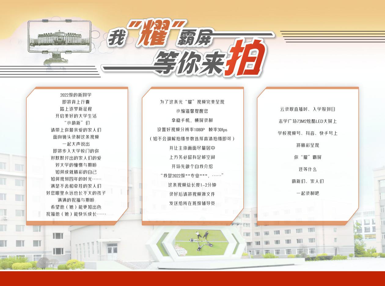 據(jù)悉,在今年的云錄取系列活動(dòng)及入學(xué)報(bào)到當(dāng)日,哈爾濱劍橋?qū)W院還將舉辦《我“耀”霸屏,等你來拍!》活動(dòng),2022級(jí)新生將帶上家人們,手持這份錄取通知書,面向鏡頭說出感恩與祝福,學(xué)校將利用志學(xué)廣場(chǎng)73M2炫酷LED大屏,制作呈現(xiàn)感恩與祝福系列視頻,為即將步入大學(xué)的新生們記錄難忘的感動(dòng)瞬間,上一堂有溫度、有意義的感恩教育開學(xué)“第一課”。