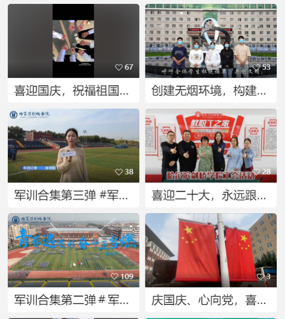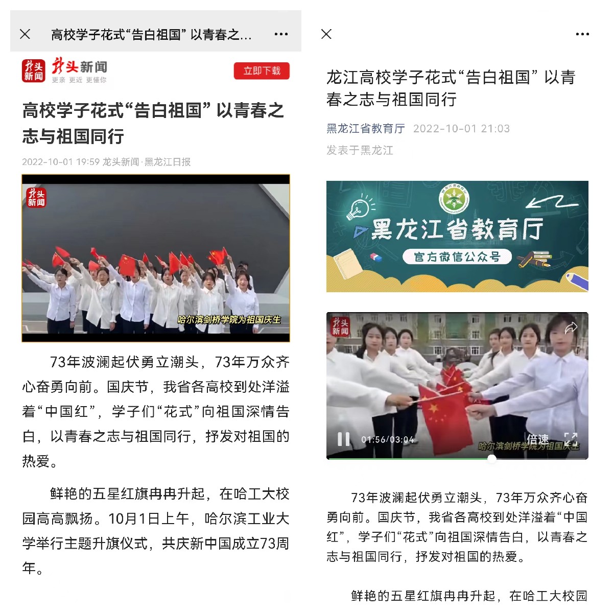 加強媒體宣傳報道。學校視頻號發(fā)布師生“喜迎二十大、迎國慶”系列視頻,教育學院、黨委宣傳部、校工會組織師生錄制“美麗中國”系列視頻,龍廣高小微、生活報等主流媒體紛紛轉發(fā);省教育廳官微、黑龍江日報龍頭新聞刊發(fā)我校青年學生以“青春”之志告白祖國為祖國慶生視頻。