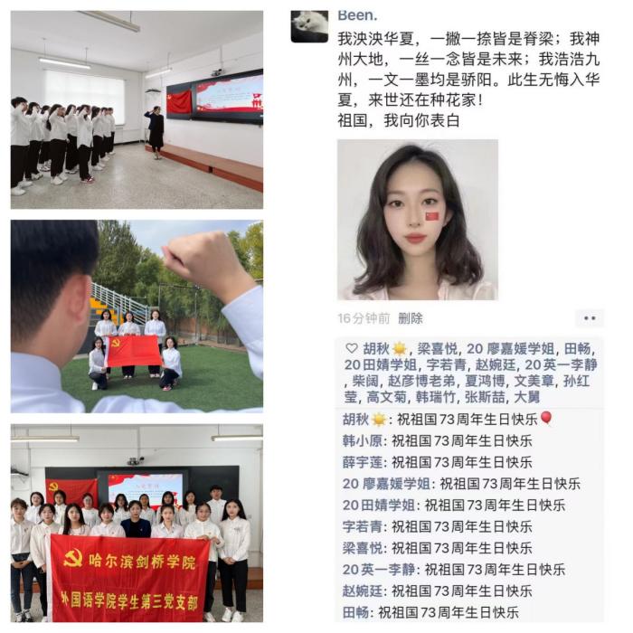 各二級學院在國慶期間以豐富多彩的形式慶祝新中國成立73周年,以青春之名,書寫澄澈摯愛;以奮進之我,祝福偉大祖國。