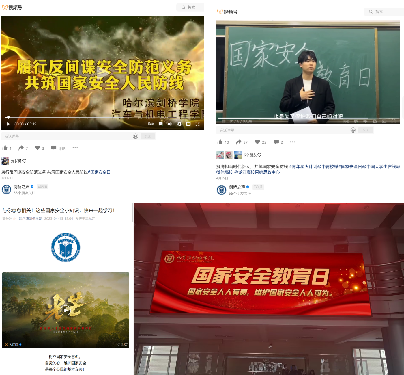學(xué)校官微、微博、“劍橋之聲”視頻號、各二級學(xué)院團(tuán)總支、學(xué)生會等新媒體平臺開展線上知識普及宣傳,并開設(shè)國家安全教育宣傳教育周專題專欄,圍繞國家安全專題知識科普、趣味問答、網(wǎng)絡(luò)安全等內(nèi)容累計發(fā)布多篇專題推送,廣泛深入開展國家安全宣傳教育,引導(dǎo)學(xué)生從自身做起,切實增強(qiáng)全民國家安全意識和法治意識,有效提升防范和抵御安全風(fēng)險能力;學(xué)校公告欄及電子屏等顯著位置張貼、投放國家安全教育主題宣傳海報及標(biāo)語,營造依法維護(hù)國家安全的強(qiáng)大聲勢和濃厚氛圍。