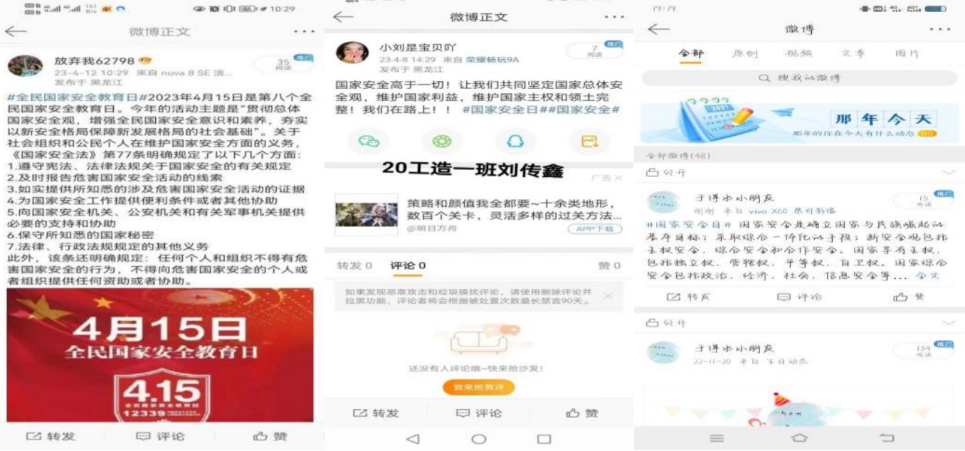 組織全體學(xué)生積極參加話題活動,其中共計6500余人參與#國家安全日#話題互動。同學(xué)們通過微博、微信、快手、抖音、B站等平臺參與#國家安全日#話題互動。