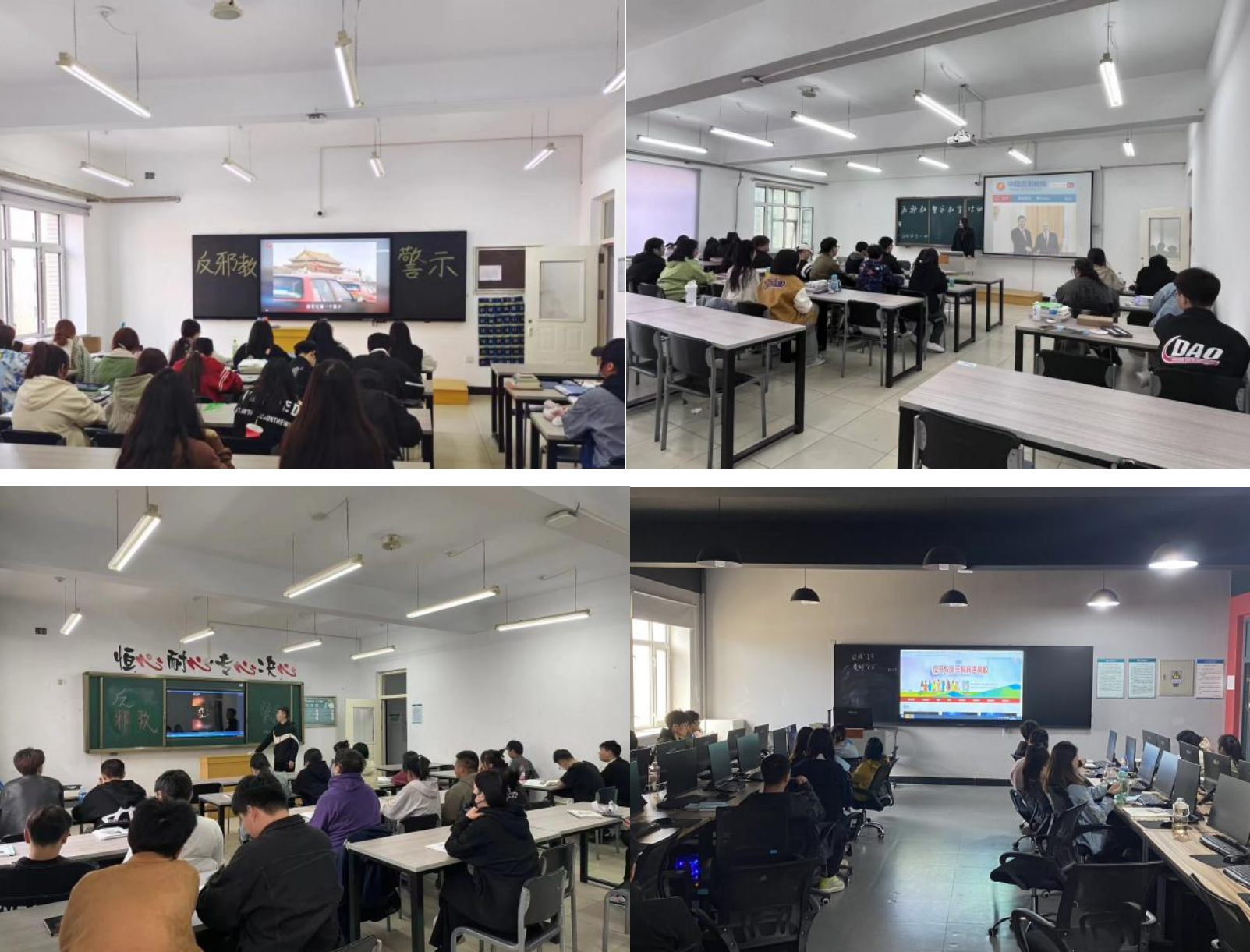 4月7日至14日,各二級學(xué)院通過主題班會的形式,組織觀看反邪教警示教育片,提高學(xué)生防范邪教的意識和能力。輔導(dǎo)員通過反邪教警示教育片、PPT等形式,生動講解邪教的社會危害、邪教與宗教的區(qū)別以及遇到邪教的應(yīng)對措施等內(nèi)容,提高了同學(xué)們抵制邪教的意識和能力,切實強(qiáng)化了反邪教宣傳教育效果。