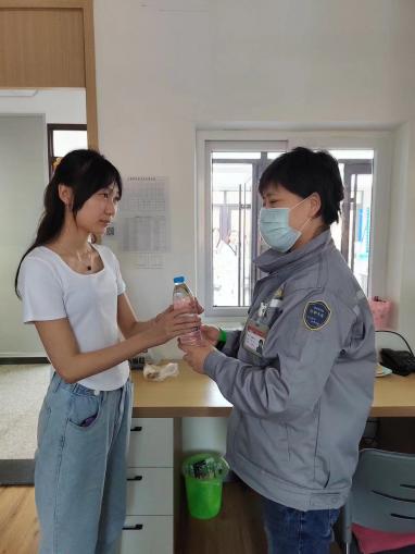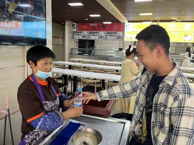 在活動期間,同學們與不同崗位的勞動者進行了深入地交流,問候了守護宿舍安全的宿管阿姨,保障學子營養(yǎng)健康的食堂叔叔阿姨……用心地為他們準備了清熱解暑的飲料?!案兄x你們保障了校園環(huán)境的整潔”、“感謝你們?yōu)槲覀冏龊贸缘娘埐恕?、“祝你們身體健康、萬事如意”等一句句暖心和關懷的話語里,飽含著同學們對這些校園勞動者們真誠的感謝和衷心的祝愿。