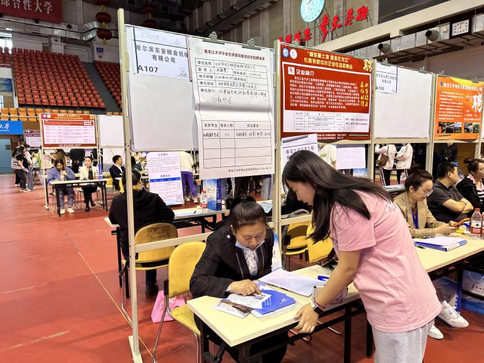 招聘會現場為幫扶同學整理工作崗位的“幫幫團成員”