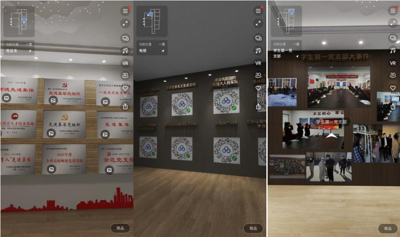 進(jìn)入展廳,配合桌面菜單欄和導(dǎo)覽,學(xué)生們可以自行選擇觀展路線,也可根據(jù)下方菜單欄隨意選擇參觀部分。展廳內(nèi)容包括各黨支部的黨建模式一覽、各項(xiàng)榮譽(yù)、主題黨日活動(dòng)、我為群眾辦實(shí)事、黨課學(xué)習(xí)材料以及與黑龍江大學(xué)藝術(shù)學(xué)院結(jié)對(duì)共建活動(dòng)等。VR科技的全景記錄使黨建模式更富有了三維立體感,同時(shí)也靈活了黨建活動(dòng)的開展角度并激發(fā)了創(chuàng)新意識(shí)。