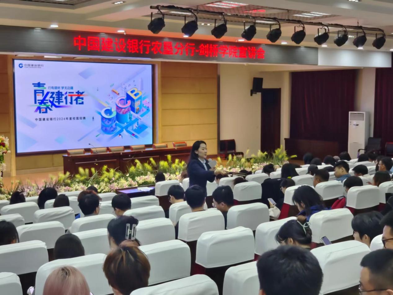 10月9日,中國建設(shè)銀行農(nóng)墾分行走進(jìn)哈爾濱劍橋?qū)W院,在圖書館學(xué)術(shù)報(bào)告廳舉辦中國建設(shè)銀行農(nóng)墾分行2024校園招聘宣講會(huì)。