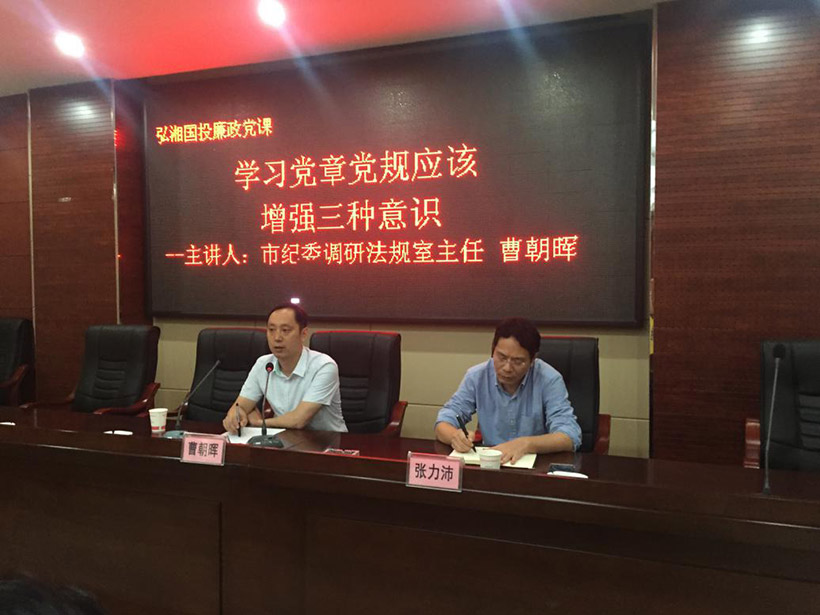 為慶祝建黨96周年,進(jìn)一步增強(qiáng)公司黨組織的凝聚力和戰(zhàn)斗力,提高黨員干部拒腐防變能力,6月27日下午,弘湘國投舉辦“迎七一”專題廉政黨課活動。會議邀請市紀(jì)委調(diào)研法規(guī)室主任曹朝暉作輔導(dǎo)講座。弘湘國投本部全體人員及子公司班子成員共計(jì)90余人聆聽了講座,公司黨組書記、董事長張力沛主持。