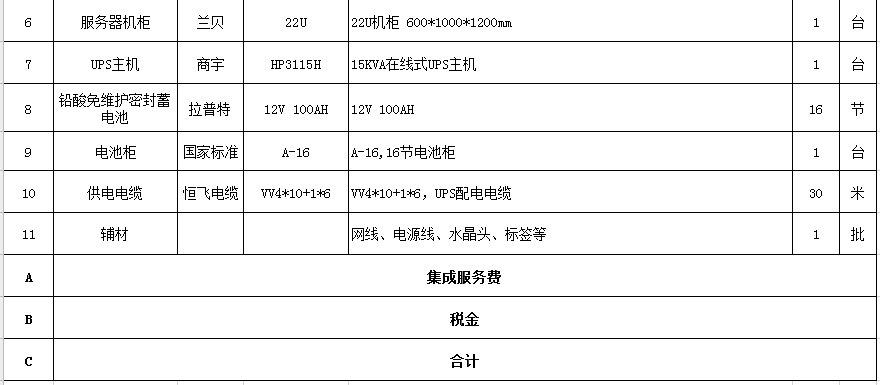 4、為保障服務器設備在斷電時不丟失業(yè)務數(shù)據(jù),需更換一套UPS設備,盡量延長服務器的待機時間。(詳細清單附后)