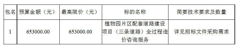 內(nèi)容:負(fù)責(zé)完成植物園片區(qū)配套道路建設(shè)項(xiàng)目(三條道路)全過(guò)程造價(jià)咨詢(xún)服務(wù)工作,具體服務(wù)內(nèi)容見(jiàn)招標(biāo)文件采購(gòu)需求。