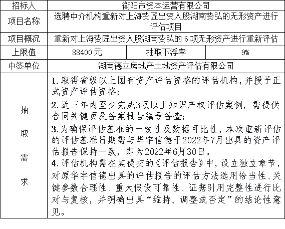 選聘中介機(jī)構(gòu)重新對上海贄匠出資入股湖南贄弘的無形資產(chǎn)進(jìn)行評估項(xiàng)目抽取結(jié)果公示